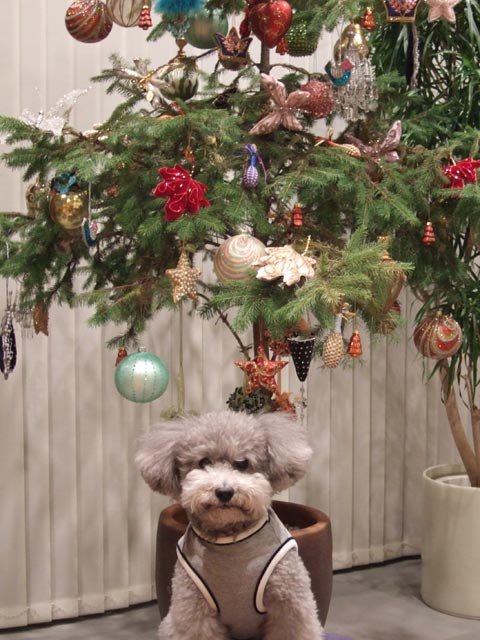 ママがクリスマスツリーを飾ったヨ♪♪ ボクはその前で記念撮影。モミの木が毎年すこしづつ大きくなっているので、上の方まで写真に入りませんでした…チョット残念。