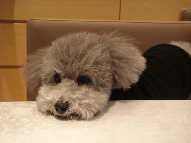 みんなが美味しそうにお茶を飲んでいるのに…ボクはとなりの椅子に座ってがまんしています。でも、アゴがつかれちゃった…ちょっとテーブルにのせて、ひと休みしちゃお〜っと!