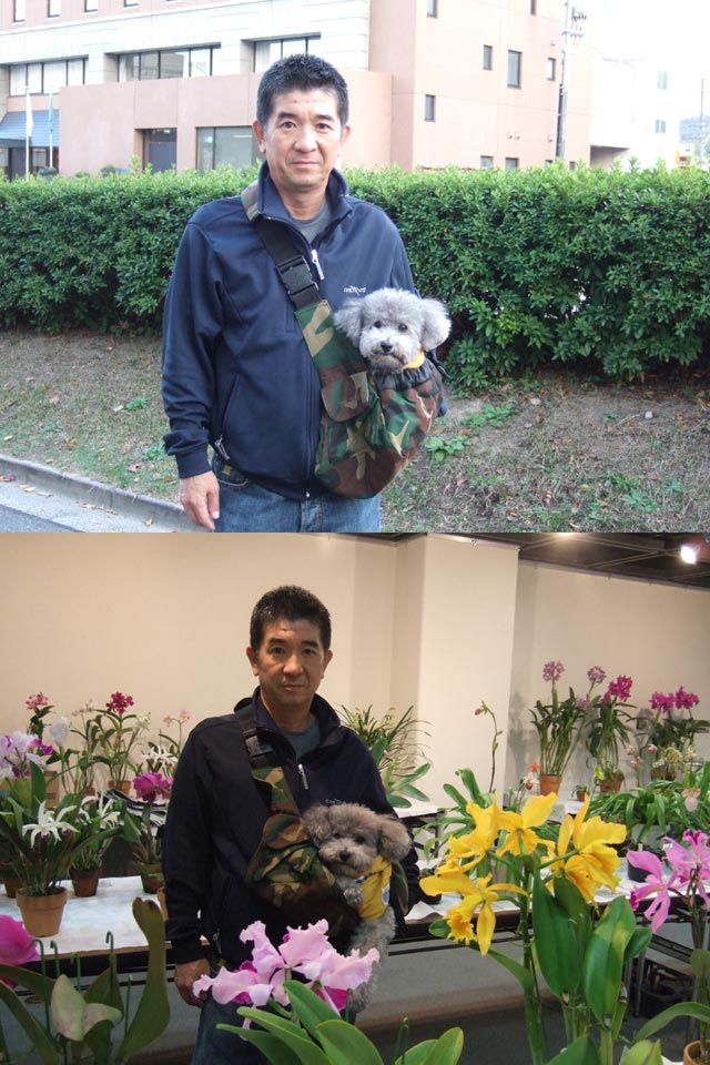 洋蘭展に行ってきました。お花を見ている途中、ボクちょっとずり落ちそう…アブナイ!!