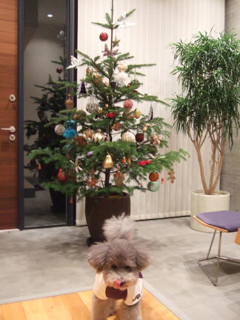 今年も玄関にクリスマスツリーを飾りました☆ ツリーと一緒に写真を撮ってもらいました〜(◎⌒⌒◎)♪とってもきれいだよ☆☆☆